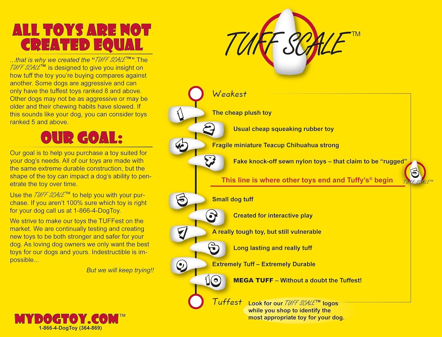 Vet recommended and approved. The toy's dimensions are 8 x 8 x 1 inches. Machine washable, air dry and they float. Tuff Scale rating of 8.
